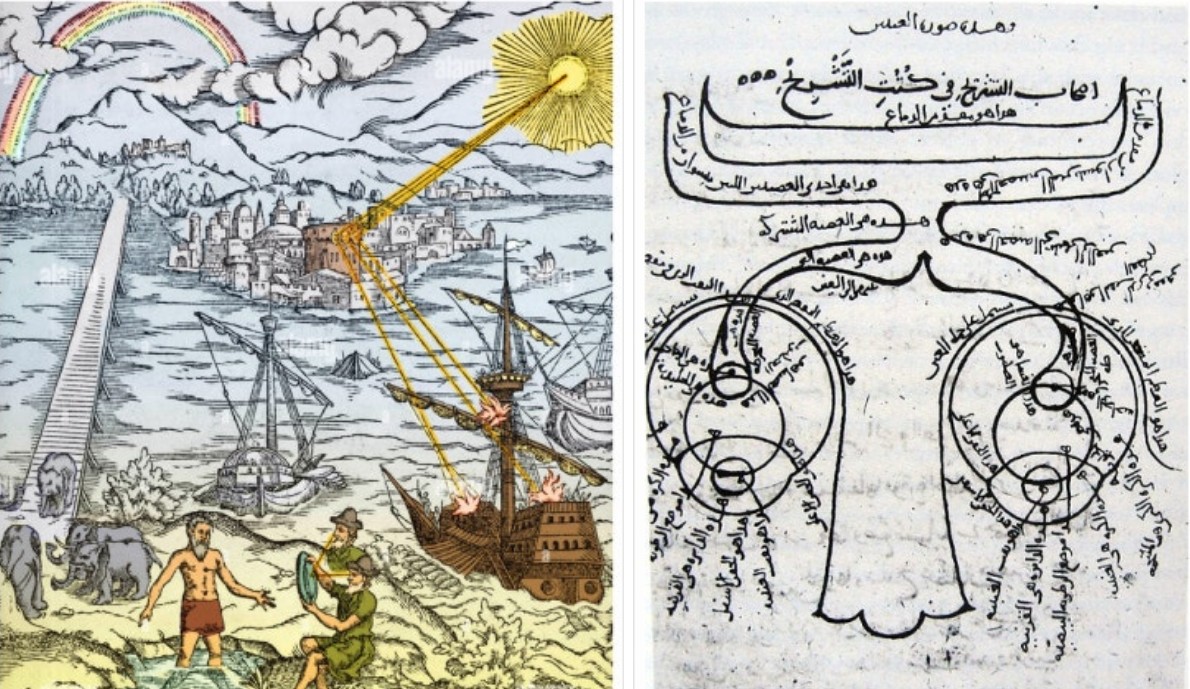 이렇게 눈에서 시각광선이 나와서 사물이 보인다는 인식은 오랫동안 지속되었지만 AD1000년 경 이러한 생각에 큰 전환점을 준 주장이 나왔는데 '광학의 서'를 저술하였으며 유럽에서 광학의 아버지라 불리는 아라비아의 학자 이븐 알하이삼(965~1040)은 "태양을 바라볼 때에 눈이 아픈것은 빛이 태양으로부터 나와서 우리의 눈을 자극하기 때문이지 우리의 눈에서 빛이 나오는것이 아니다"라고 주장했다고합니다