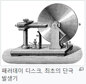 이 발전기의 원리는 2개의 자석 사이에 구리판을 닿지 않고 위치해 놓고 이 구리판을 회전시키면서 전류를 발생시키는 원리였습니다